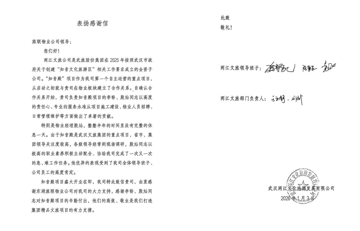 近日,物业公司收到武汉两江文化旅游发展有限公司的表扬感谢信,信中对我司派驻“知音殿”项目的李盼、殷灿两位同志在项目合作中的突出表现予以高度赞扬,这份认可不仅是对两人工作的肯定,更是对旅联物业专业服务能力的认可。