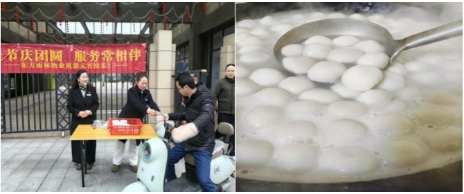 正月十五元宵佳节,为营造温馨团圆的节日氛围,东方雨林物业服务中心在园区主出入口开展了“元宵送温暖”活动,为小区业主送上热腾腾的汤圆与节日祝福。
