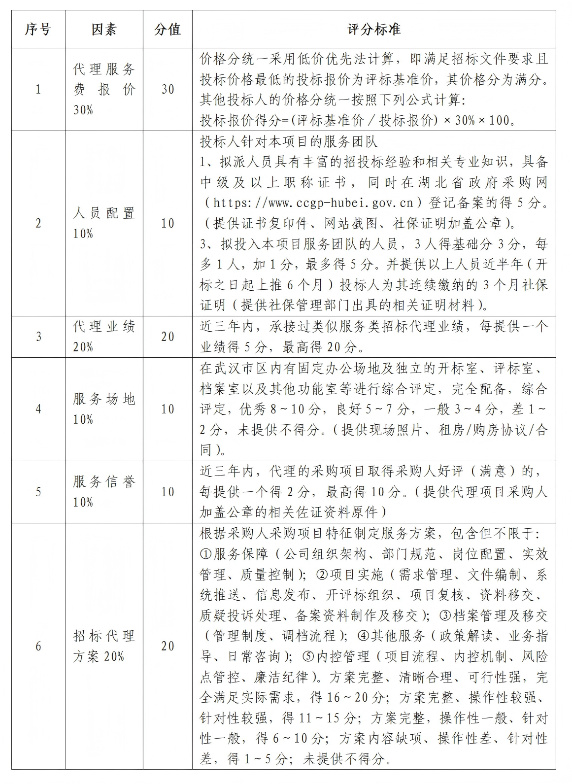 1、比选方法:综合评分法。以代理机构递交的比选响应文件的完整性、科学性、合理性及实质性响应程度为标准进行横向比较、综合评定,综合评分得分由高到低选择确定1家代理机构。