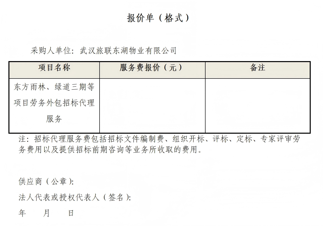 根据《武汉东湖文旅(集团)有限公司招标采购管理办法》,遵循公平、公开、公正原则,武汉旅联东湖物业有限公司现开展东方雨林、绿道三期等项目劳务外包招标代理服务比选工作,兹邀请符合条件的代理机构参与比选,现将相关事宜公告如下: