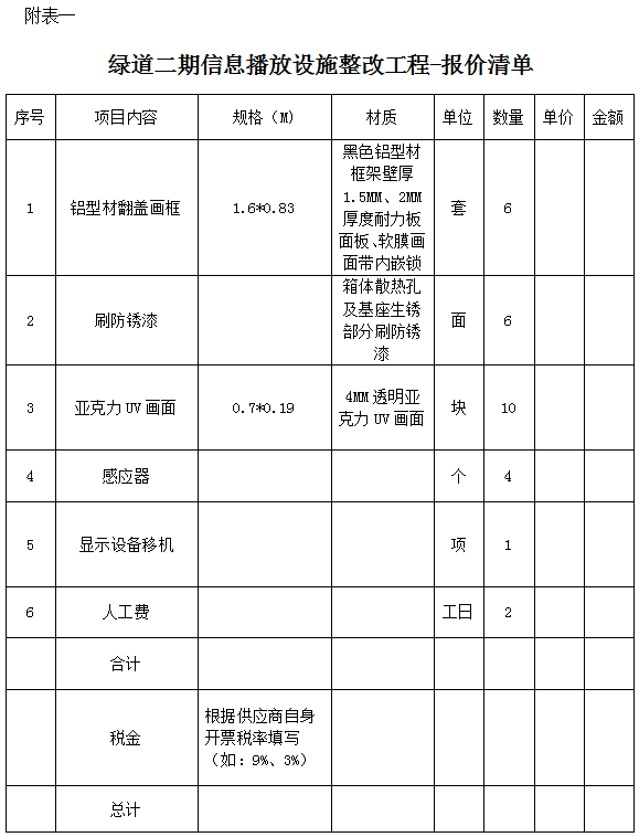 4.响应文件要求:正本1份,封面注明“绿道二期信息播放设施整改工程响应文件”。