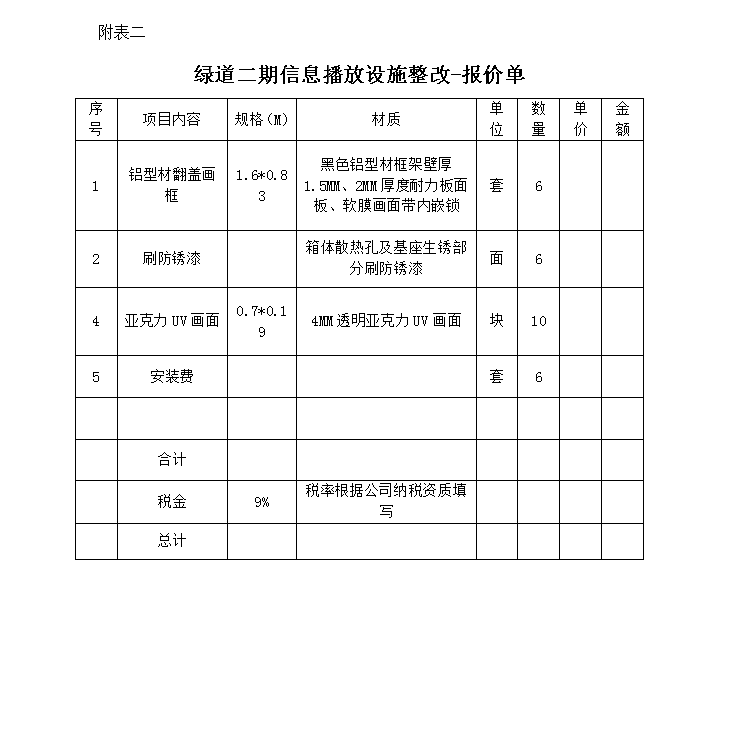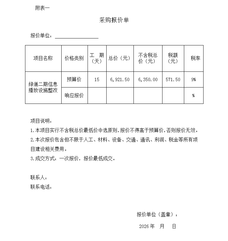 4.响应文件要求:正本1份,封面注明“绿道二期信息播放设施整改工程响应文件”。