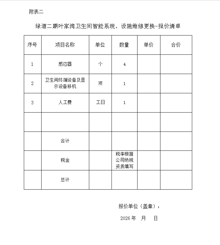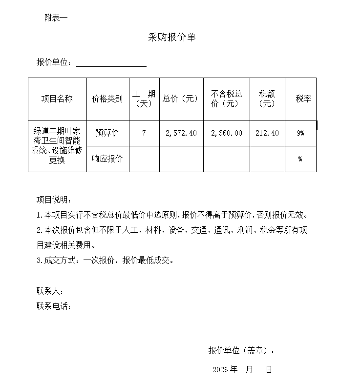 4.响应文件要求:正本1份,封面注明“绿道二期叶家湾卫生间智能系统、设施维修更换响应文件”。